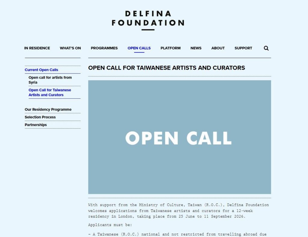 【記者蔡富丞/綜合報導】文化部駐英國代表處文化組持續與倫敦重要駐村機構戴芬娜基金會(Delfina Foundation)合作,今年將徵選1名臺灣藝術家或策展人進駐,展開為期12週的駐村計畫,時間為今年6月25日至9月11日,期以促進我國新銳藝術人才發展創作及國際連結經驗。