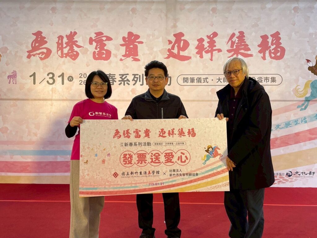 【記者蔡富丞/綜合報導】文化部所屬國立新竹生活美學館於(31)日下午舉辦 2026「馬騰富貴.迎祥集福」新春揮毫活動,在墨香與熱鬧的氣氛中,由東門國小52位同學以二首振奮人心的曲目及手舞足蹈拉開序幕,並致贈愛心發票給社團法人新竹市失智照顧協會及勵馨基金會-新竹分事務所,提前帶領民眾共同迎接馬年到來。當日吸引眾多大小朋友參與,現場排隊兌換春聯、參加創意春聯DIY區的人潮絡繹不絕,不僅展現了傳統節慶的傳承,更讓藝術與公益在美學館交織出暖心的風景。