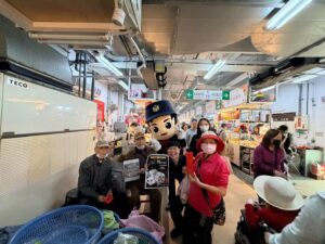 走入北投區最具代表性的年貨大家「北投中繼市場」,由北投分局長陳義宏率領超級吸晴的警察大頭娃娃,向市場攤商、採買年貨的民眾,發放警察局自製馬年紅包袋,並於現場設立機動派出所,邀請民眾走進傳統市場採買年貨、領紅包討吉利,並藉此機會將最新犯罪手法分享,以活潑、開心、互動等方式傳播出去,期望提升民眾對於詐騙、賭博及交通安全的警覺性。