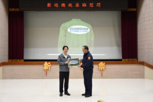 最後,中正第二分局特別準備『蒙太奇』設計手法之飛行外套,背後「GUARDIAN」及「STAND FIRM」(守護者、堅守崗位)字樣,是以八千餘張照片所組成,象徵全分局339位同仁,24小時不間斷地守護治安,匯聚成這 8,136 份堅定的決心,代表中正第二分局永遠是總統及全體人民最堅實的後盾,由分局長曹儒林代表致贈,以感謝總統撥冗於春節期間慰問全體警察人員辛勞,新的一年,中正第二分局將持續堅守崗位,落實「治安平穩、交通順暢、民眾安心」等各項工作,使社會安居樂業。