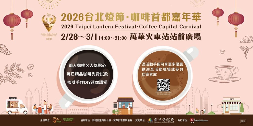當光影藝術遇上精品咖啡香,「2026台北燈節‧咖啡首都嘉年華」將於2月28日在萬華火車站站前廣場限時2天快閃。現場邀集歷屆「金杯獎」獲獎優質咖啡品牌、萬華在地名店,以及臺北市人氣點心品牌共同組成「咖啡首都精品市集」。活動期間每日限量精品咖啡或點心免費品嘗,消費滿額499元抽精緻好禮,還能參與咖啡手作DIY,並串連在地飯店、店家推出「萬華經典‧逗熱鬧」,以及金杯店家與點心品牌的「咖啡首都咖啡點心地圖散策」。