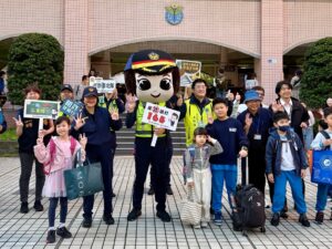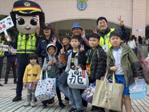 信義分局除規劃護童勤務外,另特別出動警用大型重機及警察大頭娃娃,吸引家長及學童紛紛搶合照,並透過交通及反詐圖卡解說,讓交通安全及反詐騙觀念向下紮根,也讓學童有更深刻的認識及警覺性。